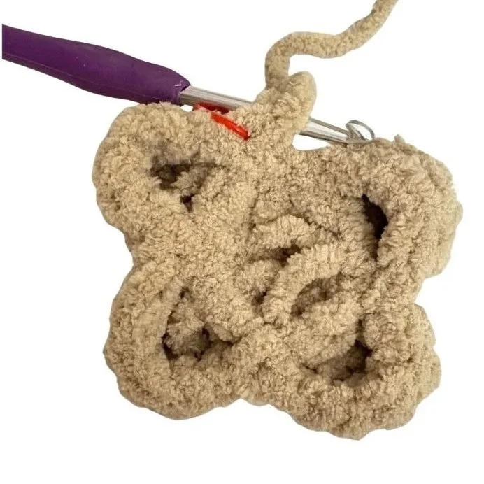 We’ll now be crocheting along the outside of the legs, ignoring the stitches that connected the legs to the body.