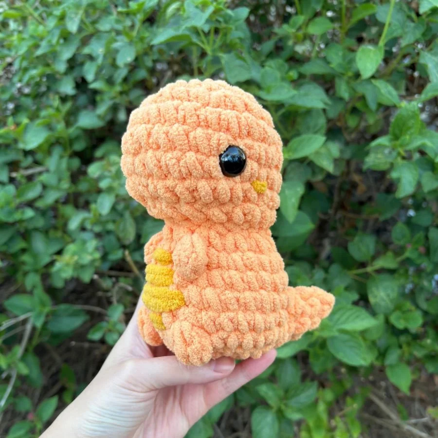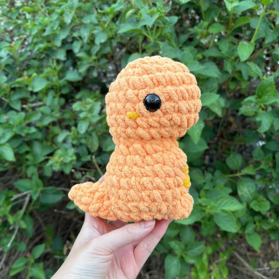 Just like the long neck dinosaur, there’s no parts to sew on in this pattern. The little T-rex’s head and body are crocheted as one continuous piece. The tail is attached using a no-sew method while crocheting the body.